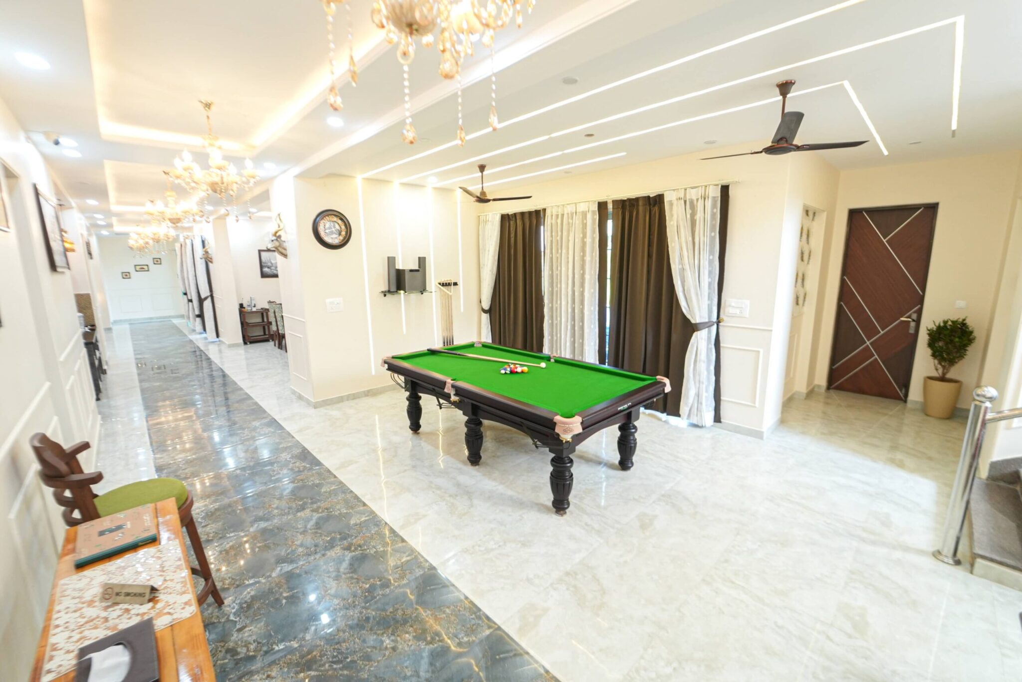 With views of the swimming pool and the resort grounds, the living room and the dining room offers a panoramic view from inside. It can accommodate a maximum of 30 guests when standing.